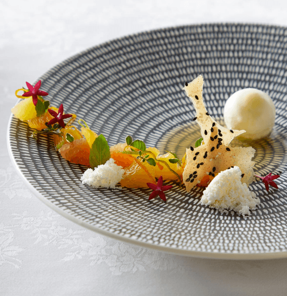 Plate parfait and garnish with orange and grapefruit segments, thyme, edible flowers, lemon snow and sesame crisp. Serve with citrus broth.